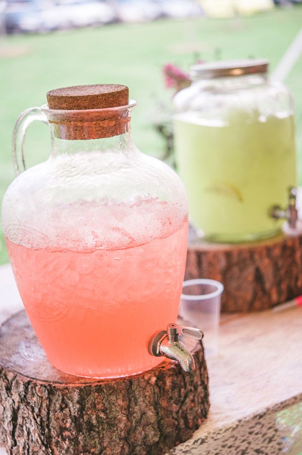 Servera dryck i en lyxig tillbringare med mycket is. Perfekt för gästerna att servera sig själva. Gör en lemonad på pressad citron och sockerlag, färgssätt med rödbeta för att få den rosa tonen.