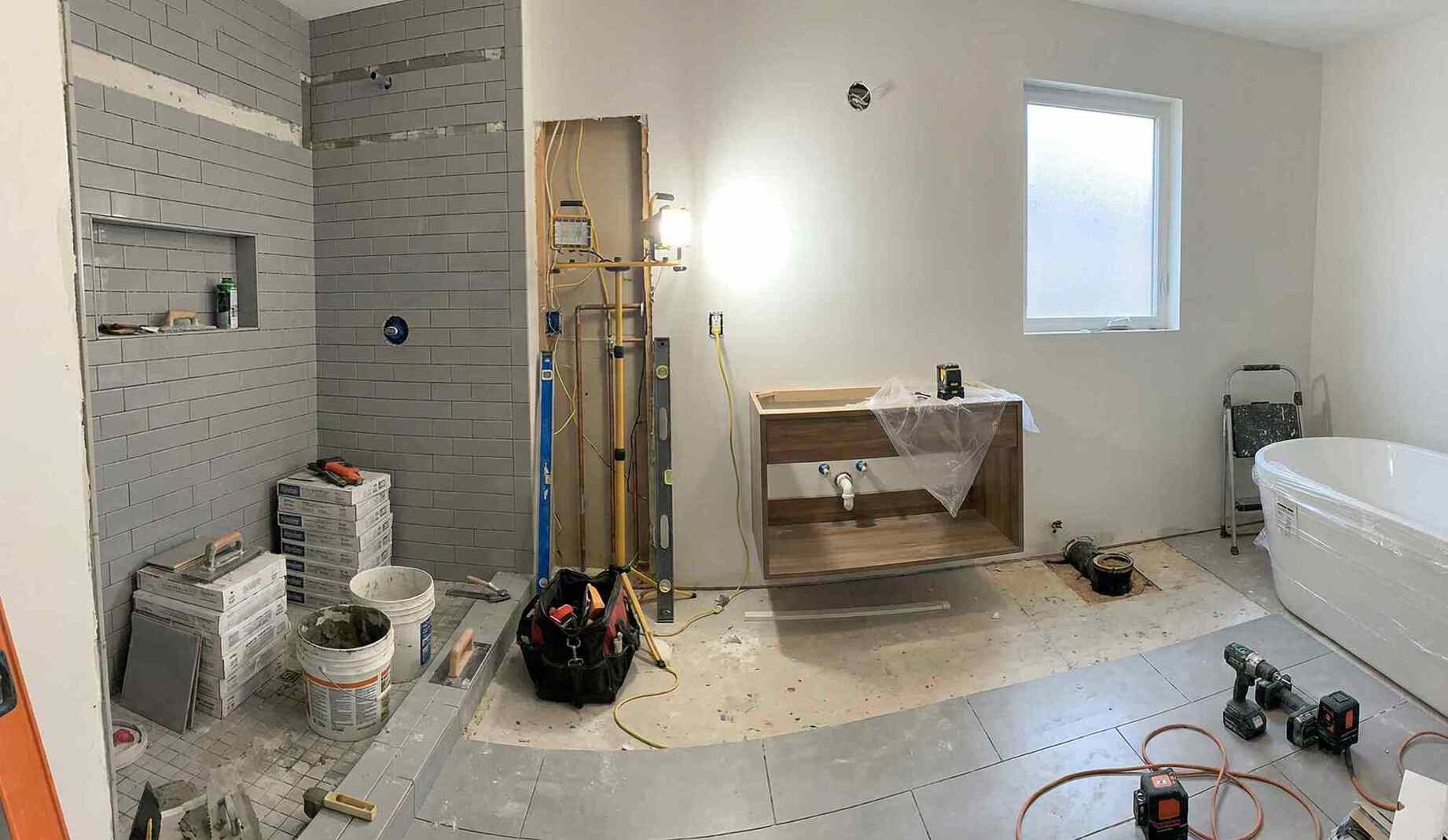Hela badrummet rivs ner till stommen. Nya rör, ny eldragning, nytt tätskiktssystem och uppbyggnad från grunden.
